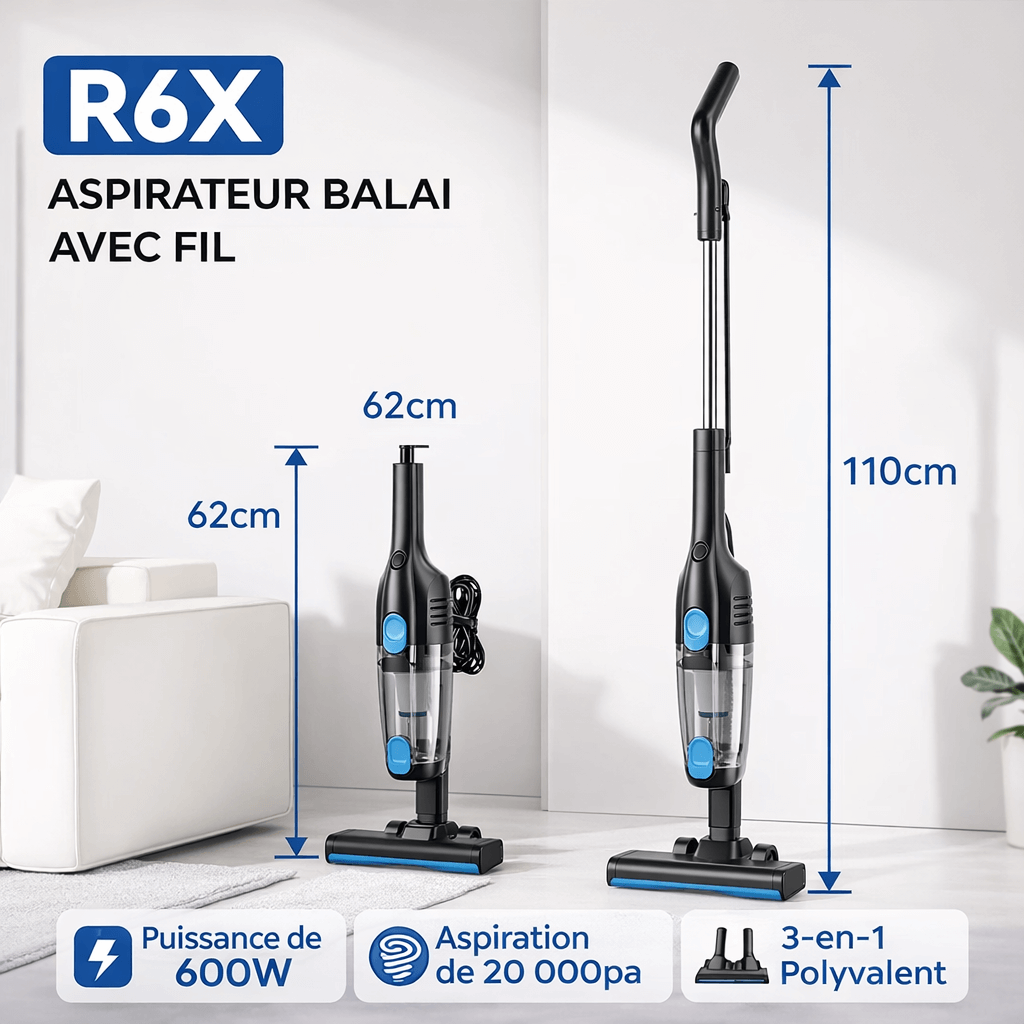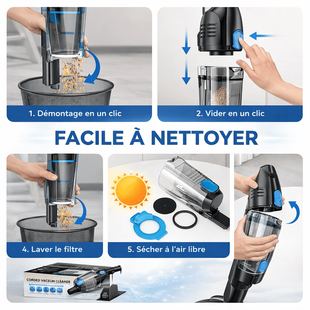 Aspirateur filaire puissant 20 000 Pa avec moteur 600W pour un nettoyage net sur sols (carrelage, marbre, parquet, tapis). Bac 1L, filtration 5 niveaux, léger (1,66 kg) et câble long ~5 m pour faire toute la maison sans stress.