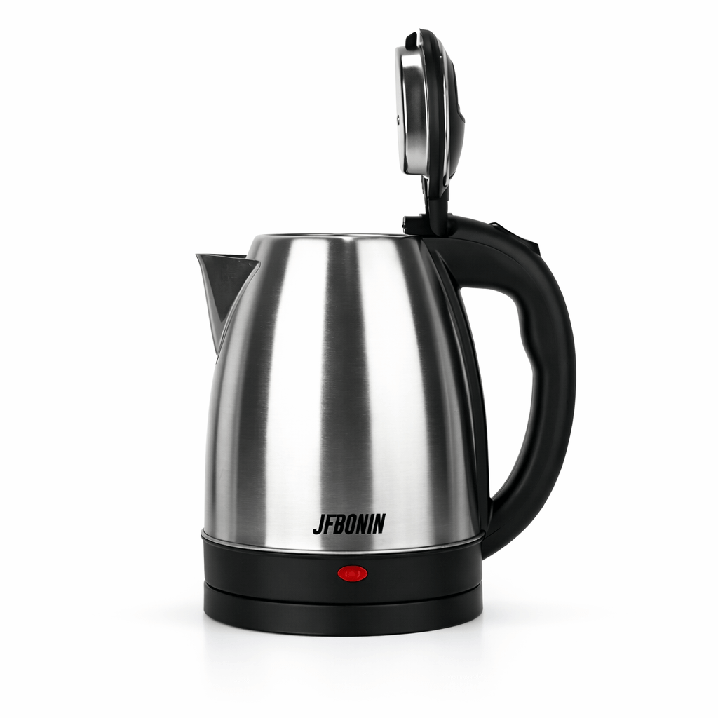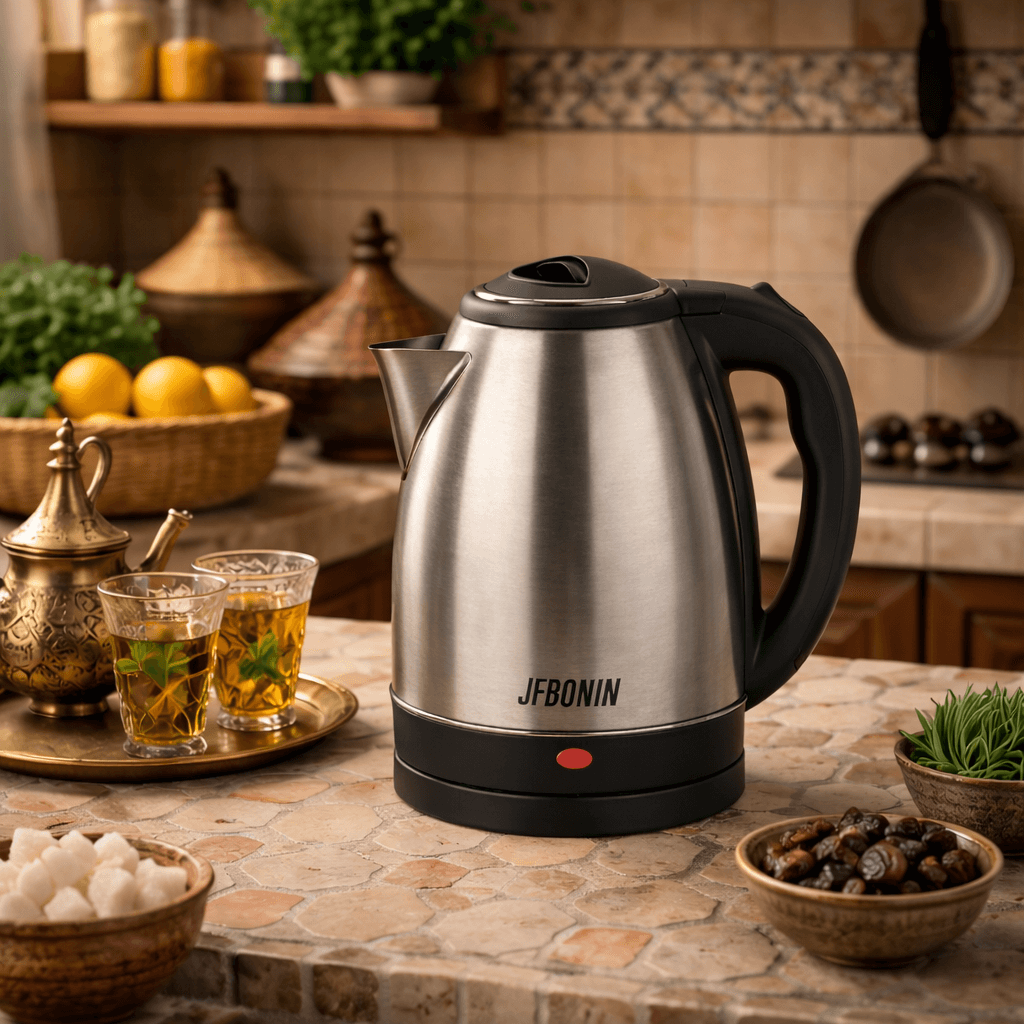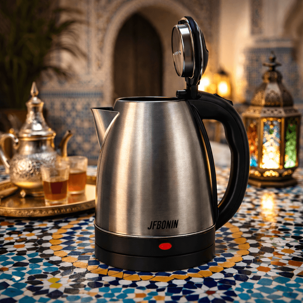 Bouilloire en acier inoxydable avec grande capacité 1,8 L et chauffe 1500W. Base rotation 360°, chauffe par le bas, et sécurité intégrée : arrêt automatique + protection contre la surchauffe.